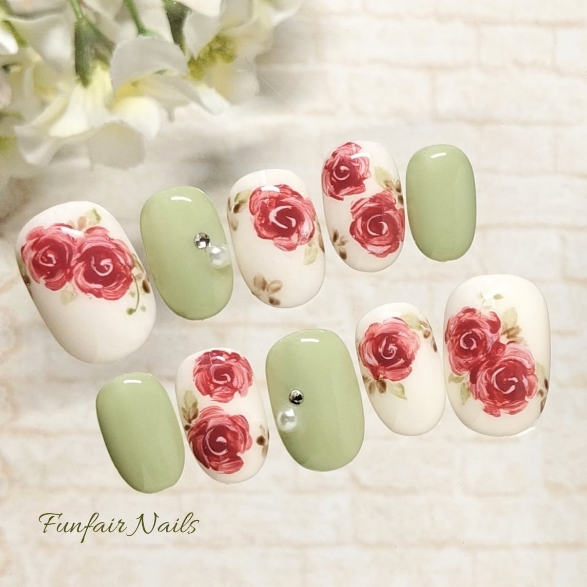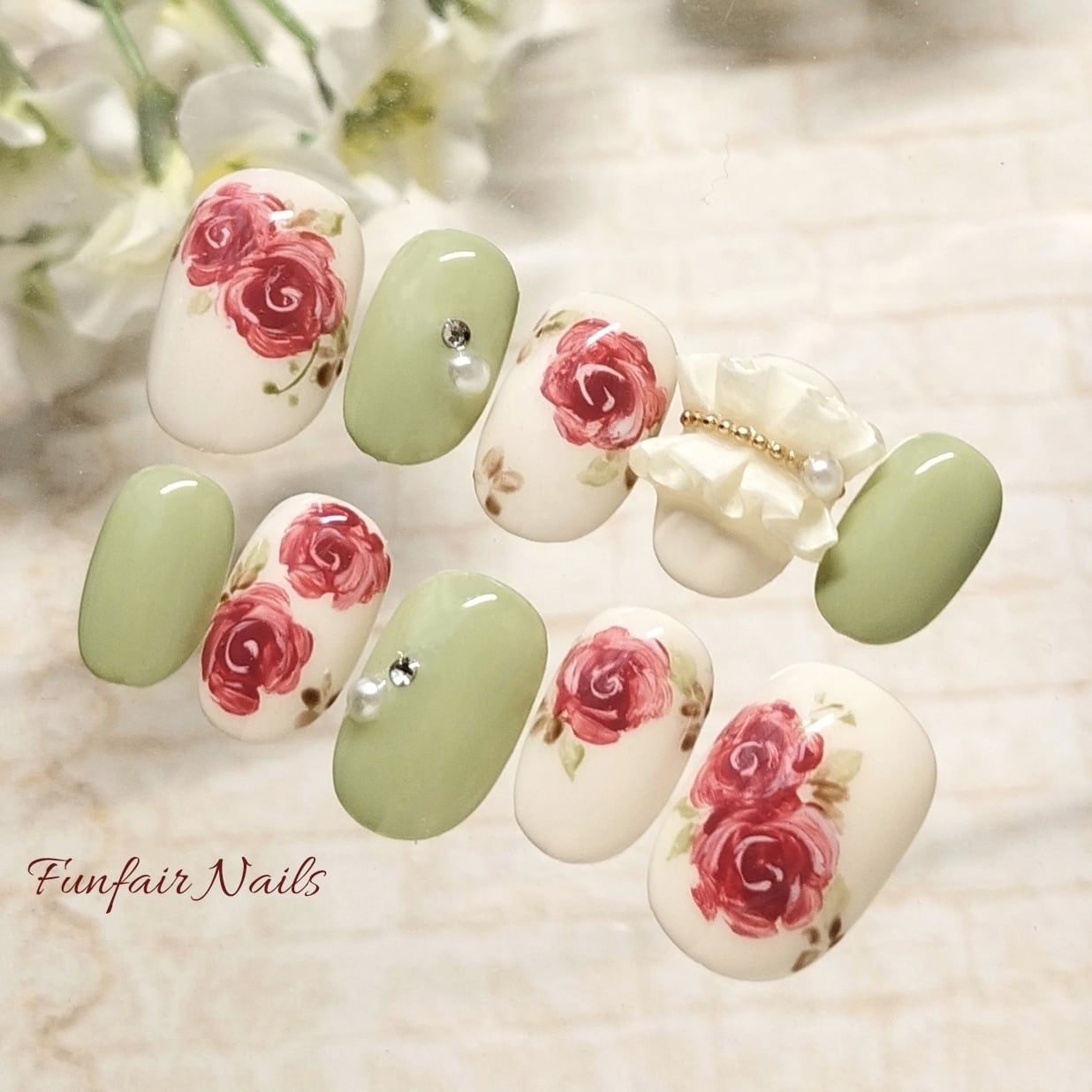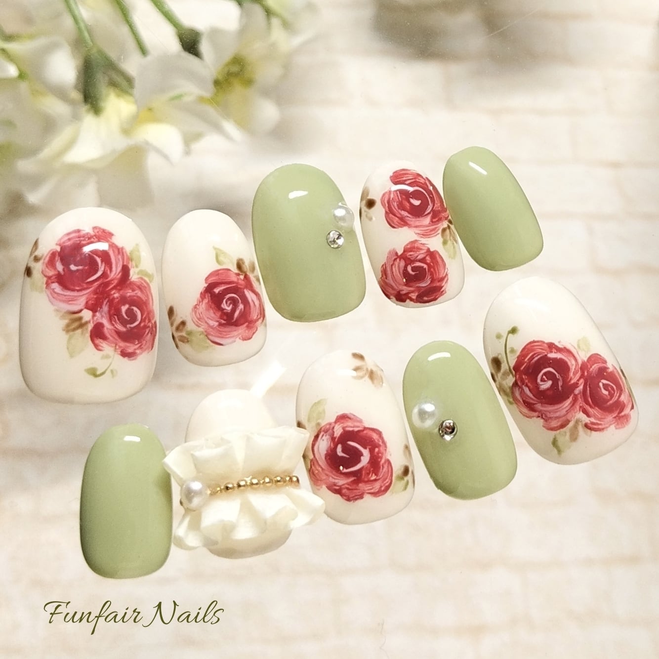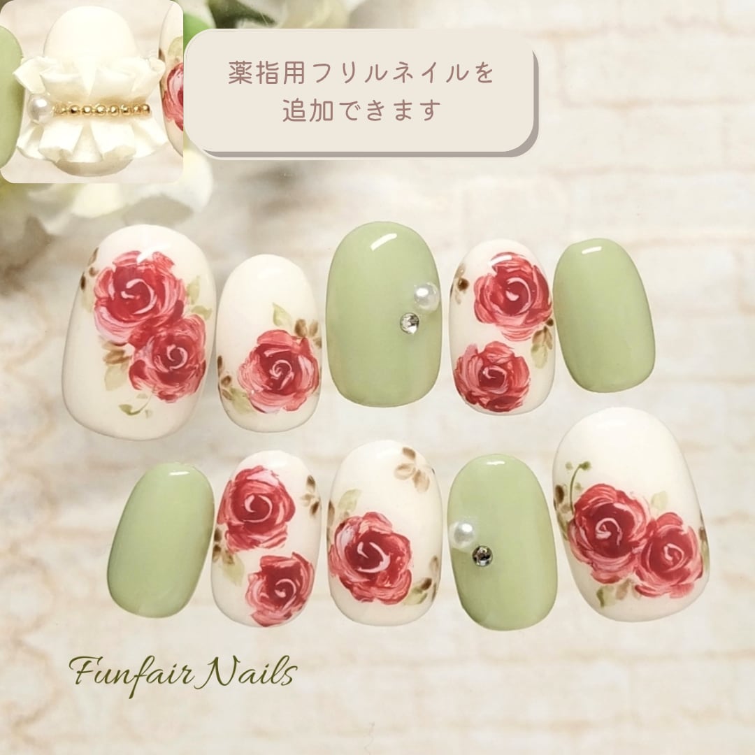 薔薇 ローズ グリーン ピンク ネイルチップ ネイルチップオーダー オーダーネイル ネイル ネイルアート つけ爪 付け爪 オーダー 可愛い かわいい 大人可愛い ガーリー 個性的 個性 おしゃれ お正月 成人式 卒業式 結婚式 ブライダル ドレス 前撮り 袴 デート 着物 着物ネイル 和装ネイル 着物女子 和 フリル シフォン フリルネイル シフォンネイル お菓子ネイル チョコネイル チョコレート レリーフ カメオ アンティーク ゴシック クラシカル クラシック ロリィタ ロリータ 原宿系 原宿 3D 3Dアート 立体 手書き 手描き