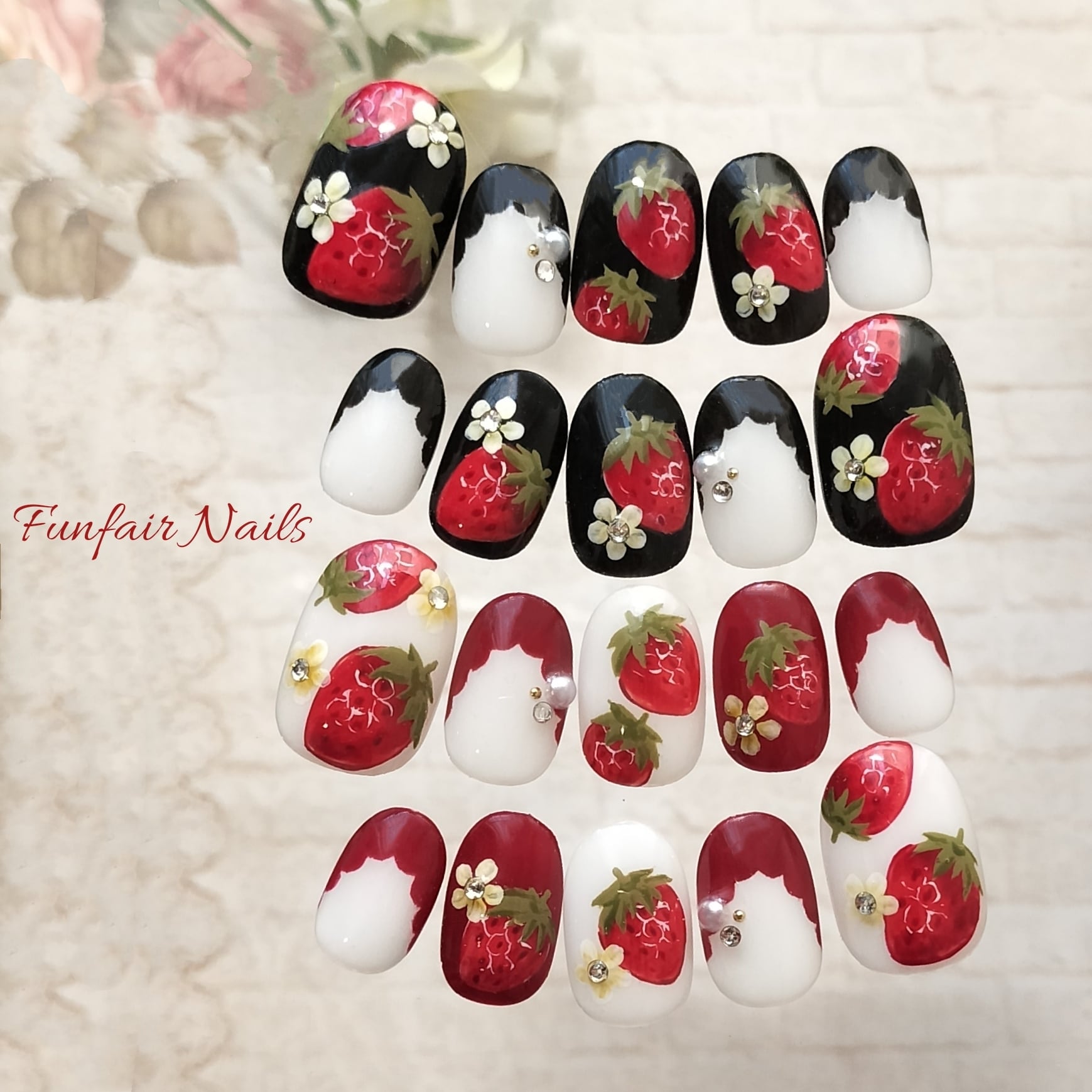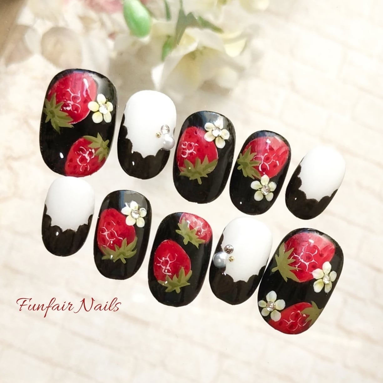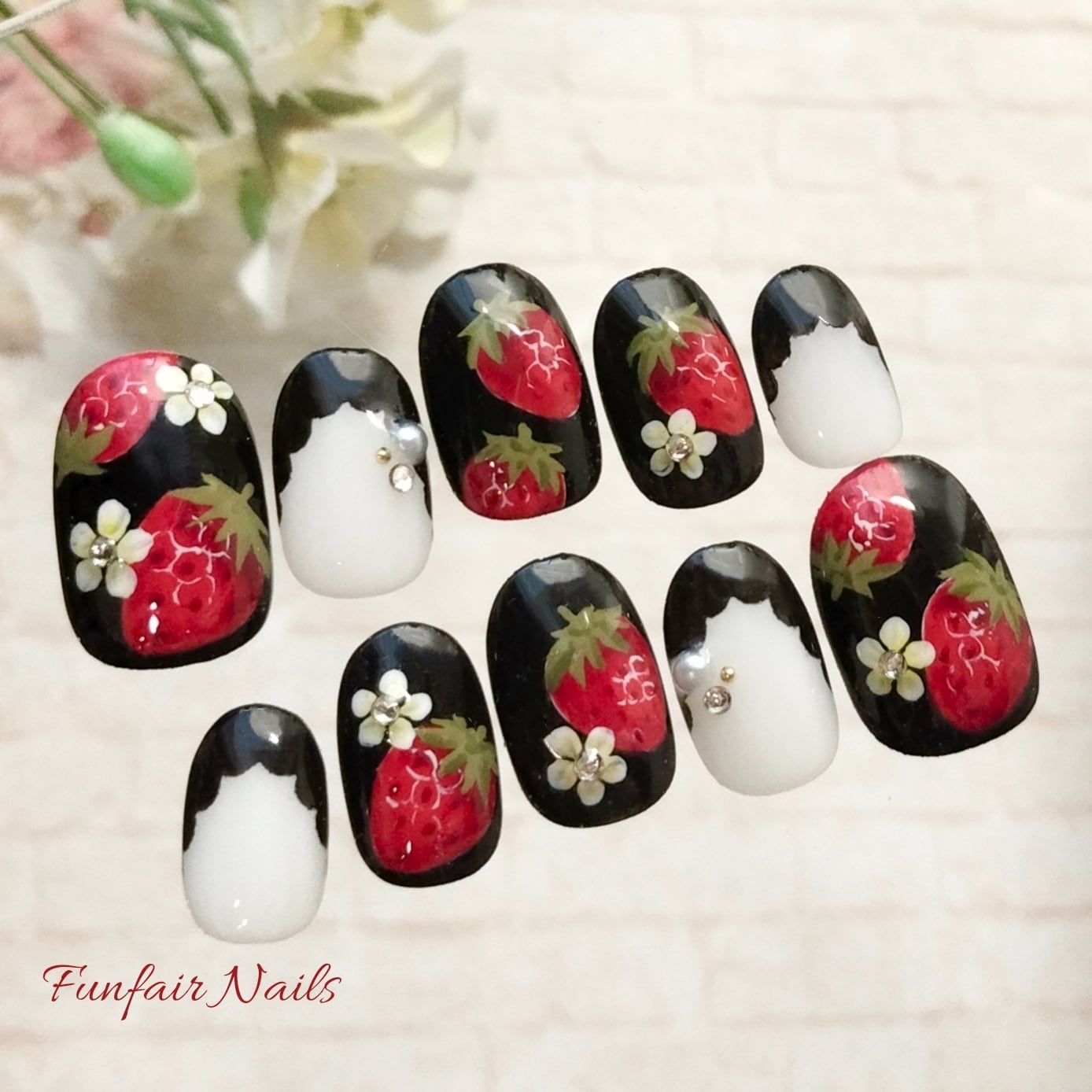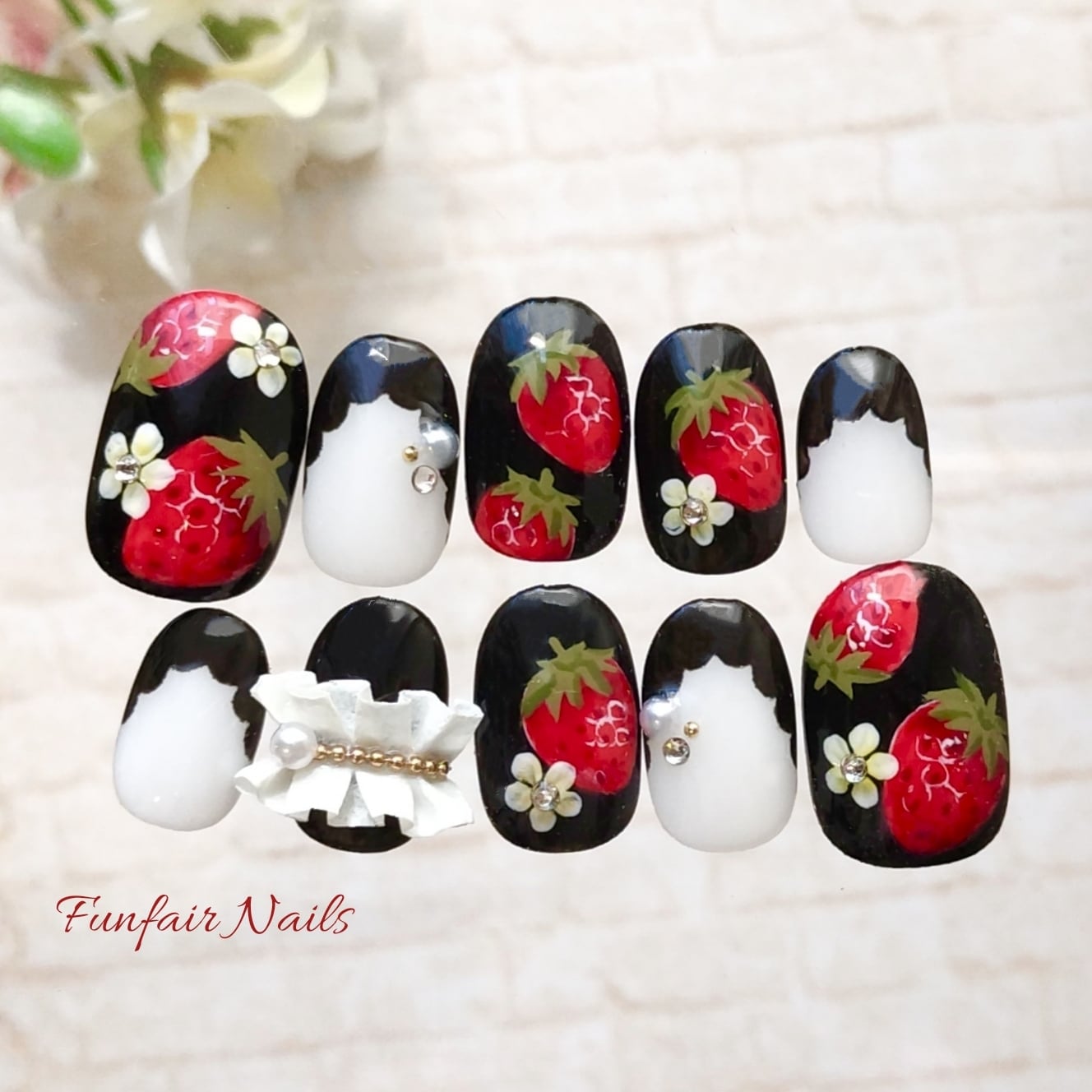 苺 ブラック ネイルチップ ネイルチップオーダー オーダーネイル ネイル ネイルアート つけ爪 付け爪 オーダー 可愛い かわいい 大人可愛い ガーリー 個性的 個性 おしゃれ お正月 成人式 卒業式 結婚式 ブライダル ドレス 前撮り 袴 デート 着物 着物ネイル 和装ネイル 着物女子 和 フリル シフォン フリルネイル シフォンネイル お菓子ネイル チョコネイル チョコレート レリーフ カメオ アンティーク ゴシック クラシカル クラシック ロリィタ ロリータ 原宿系 原宿 3D 3Dアート 立体 手書き 手描き